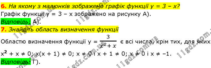 6. На якому з малюнків зображено графік функції у = 3 – х? Графік функції y = 3 – х зображено на рисунку А). Відповідь: А). 7. Знайдіть область визначення функції Областю визначення функції y = 3/(x^2+ x) є всі числа, крім тих, для яких x2 + х ≠ 0; х(х + 1) ≠ 0; x ≠ 0 i x + 1 ≠ 0; x ≠ 0 i x ≠ –1. Відповідь: Г).