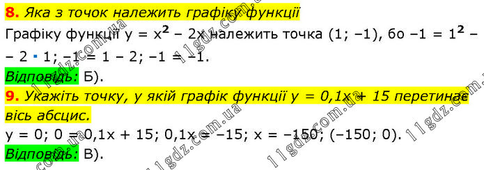 8. Яка з точок належить графіку функції Графіку функції y = x2 – 2х належить точка (1; –1), бо –1 = 12 – – 2 ∙ 1; –1 = 1 – 2; –1 = –1. Відповідь: Б). 9. Укажіть точку, у якій графік функції у = 0,1х + 15 перетинає вісь абсцис. y = 0; 0 = 0,1х + 15; 0,1х = –15; х = –150; (–150; 0). Відповідь: В).