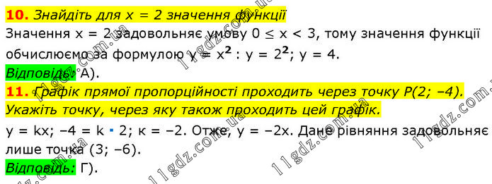 10. Знайдіть для х = 2 значення функції Значення х = 2 задовольняє умову 0 ≤ х < 3, тому значення функції обчислюємо за формулою у = x2 : y = 22; у = 4. Відповідь: А). 11. Графік прямої пропорційності проходить через точку Р(2; –4). Укажіть точку, через яку також проходить цей графік. у = kх; –4 = k ∙ 2; к = –2. Отже, у = –2х. Дане рівняння задовольняє лише точка (3; –6). Відповідь: Г).