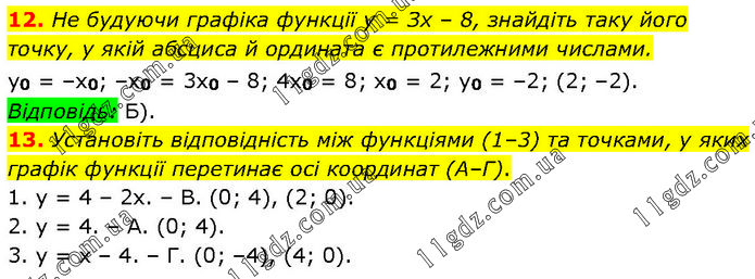 12. He будуючи графіка функції у = Зx – 8, знайдіть таку його точку, у якій абсциса й ордината є протилежними числами. y0 = –х0; –x0 = 3x0 – 8; 4х0 = 8; x0 = 2; у0 = –2; (2; –2). Відповідь: Б). 13. Установіть відповідність між функціями (1–3) та точками, у яких графік функції перетинає осі координат (А–Г). 1. у = 4 – 2х. – В. (0; 4), (2; 0). 2. у = 4. – А. (0; 4). 3. у = х – 4. – Г. (0; –4), (4; 0).