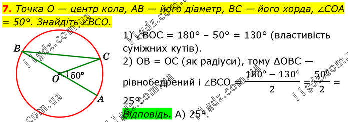 Точка O — центр кола, AB — його діаметр, BC — його хорда, ∠COA = 50°. Знайдіть ∠BCO. 1) ∠BOC = 180° – 50° = 130° (властивість суміжних кутів). 2) OB = OC (як радіуси), тому ∆OBC — рівнобедрений і ∠BCO = (180° - 130°)/2 = (50°)/2 = 25°. Відповідь. А) 25°.