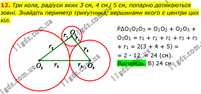 Три кола, радіуси яких 3 см, 4 см і 5 см, попарно дотикаються зовні. Знайдіть периметр трикутника, вершинами якого є центри цих кіл. Р∆О1О2О3 = О1О2 + О2О3 + О3О1 = r1 + r2 + r2 + r3 + r3 + r1 = 2(3 + 4 + 5) = 2 ∙ 12 = 24 (см). Відповідь. В) 24 см.