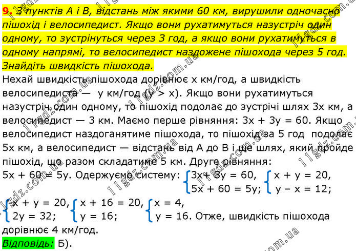 З пунктів A i В, відстань між якими 60 км, вирушили одночасно пішохід і велосипедист. Якщо вони рухатимуться назустріч один одному, то зустрінуться через З год, а якщо вони рухатимуться в одному напрямі, то велосипедист наздожене пішохода через 5 год. Знайдіть швидкість пішохода. Нехай швидкість пішохода дорівнює х км/год, а швидкість велосипедиста — y км/год (у > х). Якщо вони рухатимуться назустріч один одному, то пішохід подолає до зустрічі шлях 3х км, а велосипедист — 3 км. Маємо перше рівняння: 3х + 3у = 60. Якщо велосипедист наздоганятиме пішохода, то пішохід за 5 год подолає 5х км, а велосипедист — відстань від A до B і ще шлях, який пройде пішохід, що разом складатиме 5 км. Друге рівняння: 5х + 60 = 5у. Одержуємо систему: