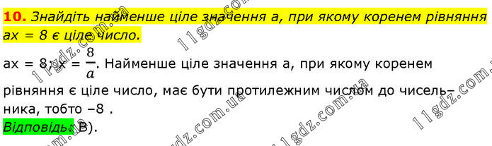 Знайдіть найменше ціле значення а, при якому коренем рівняння ах = 8 є ціле число. ах = 8; х = 8/a. Найменше ціле значення а, при якому коренем рівняння є ціле число, має бути протилежним числом до чисель–ника, тобто –8. Відповідь: В).