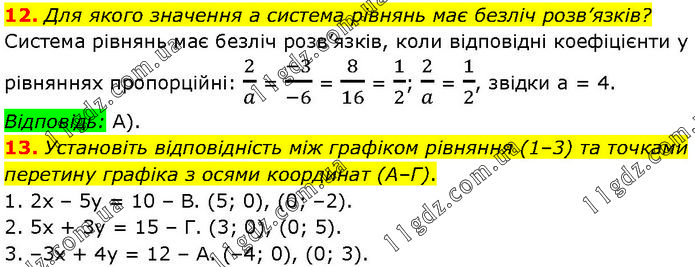 12. Для якого значення а система рівнянь має безліч розв’язків? Система рівнянь має безліч розв’язків, коли відповідні коефіцієнти у рівняннях пропорційні: 2/a = (-3)/(-6) = 8/16 = 1/2; 2/a = 1/2, звідки а = 4. Відповідь: A). 13. Установіть відповідність між графіком рівняння (1–3) та точками перетину графіка з осями координат (А–Г). 1. 2х – 5у = 10 – В. (5; 0), (0; –2). 2. 5х + 3у = 15 – Г. (3; 0), (0; 5). 3. –3x + 4у = 12 – А. (–4; 0), (0; 3).