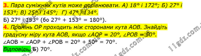 3. Пара суміжних кутів може дорівнювати. А) 18° і 172°; Б) 27° і 153°; В) 25° і 145°; Г) 47° і 134°. Б) 27° і 153° (бо 27° + 153° = 180°). 4. Промінь OP проходить між сторонами кута AOB. Знайдіть градусну міру кута AOB, якщо ∠AOP = 20°, ∠POB = 50°. ∠AOB = ∠AOP + ∠POB = 20° + 50° = 70°. Відповідь. Б) 70°.