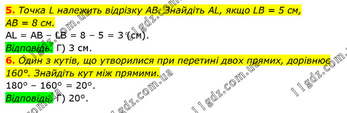 5. Точка L належить відрізку AB. Знайдіть AL, якщо LB = 5 см, AB = 8 см. AL = AB – LB = 8 – 5 = 3 (см). Відповідь. Г) 3 см. 6. Один з кутів, що утворилися при перетині двох прямих, дорівнює 160°. Знайдіть кут між прямими. 180° – 160° = 20°. Відповідь. Г) 20°.