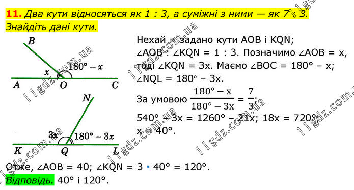Два кути відносяться як 1 : 3, а суміжні з ними — як 7 : 3. Знайдіть дані кути. Нехай = задано кути AOB і KQN; ∠AOB : ∠KQN = 1 : 3. Позначимо ∠AOB = х, тоді ∠KQN = Зх. Маємо ∠BOC = 180° – х; ∠NQL = 180° – 3х. За умовою (180° - х)/(180° - 3х) = 7/3; 540° – Зх = 1260° – 21х; 18х = 720°; х = 40°. Отже, ∠AOB = 40; ∠KQN = 3 ∙ 40° = 120°. Відповідь. 40° і 120°.
