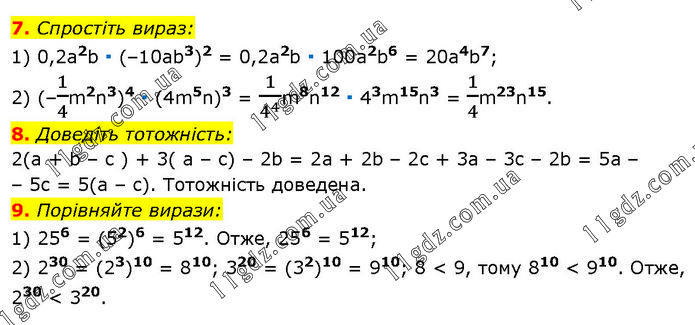 7. Спростіть вираз: 1) 0,2a2b ∙ (–10ab3)2 = 0,2a2b ∙ 100a2b6 = 20a4b7; 2) (–1/4m2n3)4 ∙ (4m5n)3 = 1/4^4 m8n12 ∙ 43m15n3 = 1/4m23n15. 8. Доведіть тотожність: 2(a + b – c ) + 3( a – c) – 2b = 2a + 2b – 2c + 3a – 3c – 2b = 5a – – 5c = 5(a – c). Тотожність доведена. 9. Порівняйте вирази: 1) 256 = (52)6 = 512. Отже, 256 = 512; 2) 230 = (23)10 = 810; 320 = (32)10 = 910; 8 < 9, тому 810 < 910. Отже, 230 < 320.