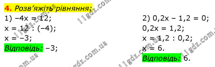 4. Розв’яжіть рівняння: 1) –4x = 12; x = 12 : (–4); x = –3; Відповідь: –3; 2) 0,2x – 1,2 = 0; 0,2x = 1,2; x = 1,2 : 0,2; x = 6. Відповідь: 6.