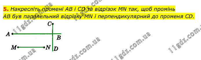 Накресліть промені AB і CD та відрізок MN так, щоб промінь AB був паралельний відрізку MN і перпендикулярний до променя CD.