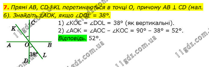 Прямі AB, CD і KL перетинаються в точці О, причому AB ⊥ CD (мал. 6). Знайдіть ∠AOK, якщо ∠DOL = 38°. 1) ∠KOC = ∠DOL = 38° (як вертикальні). 2) ∠AOK = ∠AOC – ∠KOC = 90° – 38° = 52°. Відповідь. 52°.