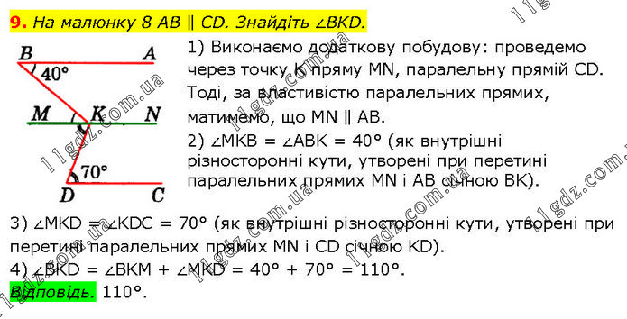 На малюнку 8 AB ∥ CD. Знайдіть ∠BKD. 1) Виконаємо додаткову побудову: проведемо через точку K пряму MN, паралельну прямій CD. Тоді, за властивістю паралельних прямих, матимемо, що MN ∥ AB. 2) ∠MKB = ∠ABK = 40° (як внутрішні різносторонні кути, утворені при перетині паралельних прямих MN і AB січною BK). 3) ∠MKD = ∠KDC = 70° (як внутрішні різносторонні кути, утворені при перетині паралельних прямих MN i CD січною KD). 4) ∠BKD = ∠BKM + ∠MKD = 40° + 70° = 110°. Відповідь. 110°.