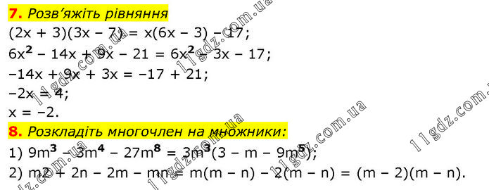 7. Розв’яжіть рівняння (2х + 3)(3х – 7) = х(6х – 3) – 17; 6х2 – 14х + 9х – 21 = 6x2 – 3х – 17; –14х + 9х + 3х = –17 + 21; –2х = 4; х = –2. 8. Розкладіть многочлен на множники: 1) 9m3 – 3m4 – 27m8 = 3m3(3 – m – 9m5); 2) m2 + 2n – 2m – mn = m(m – n) – 2(m – n) = (m – 2)(m – n).