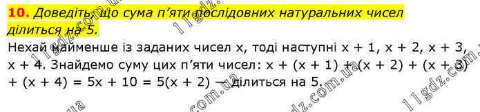 Доведіть, що сума п’яти послідовних натуральних чисел ділиться на 5. Нехай найменше із заданих чисел х, тоді наступні х + 1, х + 2, х + 3, х + 4. Знайдемо суму цих п’яти чисел: х + (х + 1) + (х + 2) + (х + 3) + (х + 4) = 5х + 10 = 5(х + 2) — ділиться на 5.