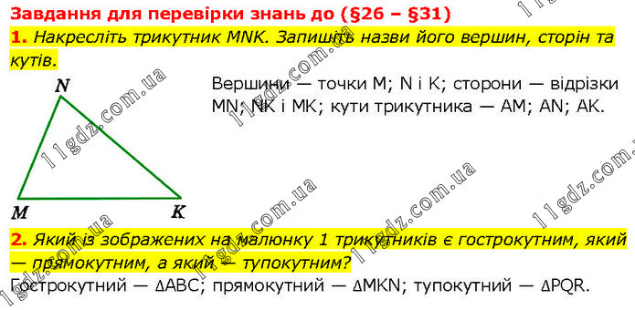 Завдання для перевірки знань до (§26 – §31) 1. Накресліть трикутник MNK. Запишіть назви його вершин, сторін та кутів. Вершини — точки М; N і K; сторони — відрізки MN; NK і MK; кути трикутника — AM; AN; AK. 2. Який із зображених на малюнку 1 трикутників є гострокутним, який — прямокутним, а який — тупокутним? Гострокутний — ∆ABC; прямокутний — ∆MKN; тупокутний — ∆PQR.