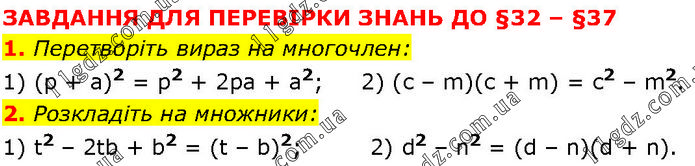 ЗАВДАННЯ ДЛЯ ПЕРЕВІРКИ ЗНАНЬ ДО §32 – §37 1. Перетворіть вираз на многочлен: 1) (р + а)2 = р2 + 2ра + а2; 2) (с – m)(с + m) = с2 – m2. 2. Розкладіть на множники: 1) t2 – 2tb + b2 = (t – b)2; 2) d2 – n2 = (d – n)(d + n).