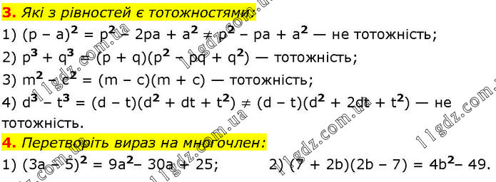 3. Які з рівностей є тотожностями: 1) (р – а)2 = р2 – 2ра + a2 ≠ p2 – ра + а2 — не тотожність; 2) р3 + q3 = (p + q)(p2 – pq + q2) — тотожність; 3) m2 – c2 = (m – с)(m + с) — тотожність; 4) d3 – t3 = (d – t)(d2 + dt + t2) ≠ (d – t)(d2 + 2dt + t2) — не тотожність. 4. Перетворіть вираз на многочлен: 1) (3а – 5)2 = 9a2– 30а + 25; 2) (7 + 2b)(2b – 7) = 4b2– 49.