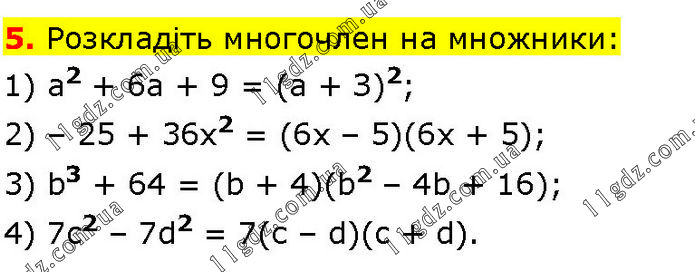 Розкладіть многочлен на множники: 1) а2 + 6а + 9 = (а + З)2; 2) – 25 + 36х2 = (6х – 5)(6х + 5); 3) b3 + 64 = (b + 4)(b2 – 4b + 16); 4) 7c2 – 7d2 = 7(с – d)(c + d).