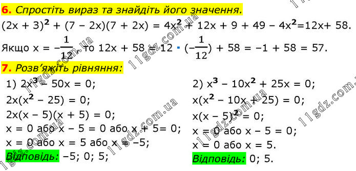 6. Спростіть вираз та знайдіть його значення. (2х + З)2 + (7 – 2х)(7 + 2х) = 4x2 + 12x + 9 + 49 – 4x2 = 12х + 58. Якщо х = –1/12, то 12х + 58 = 12 ∙ (–1/12) + 58 = –1 + 58 = 57. 7. Розв’яжіть рівняння: 1) 2x3 – 50x = 0; 2х(х2 – 25) = 0; 2х(х – 5)(х + 5) = 0; х = 0 або х – 5 = 0 або х + 5 = 0; х = 0 або x = 5 або х = –5; Відповідь: –5; 0; 5; 2) x3 – 10x2 + 25x = 0; x(x2 – 10x + 25) = 0; х(х – 5)2 = 0; х = 0 або х – 5 = 0; х = 0 або х = 5. Відповідь: 0; 5.