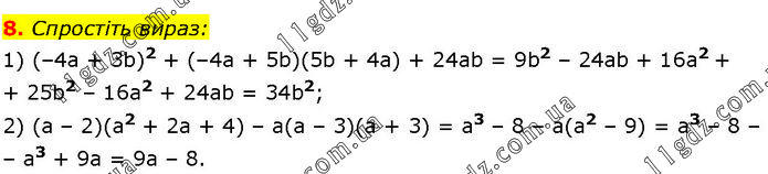Спростіть вираз: 1) (–4а + 3b)2 + (–4а + 5b)(5b + 4а) + 24аb = 9b2 – 24аb + 16а2 + 25b2 – 16а2 + 24аb = 34b2; 2) (а – 2)(а2 + 2а + 4) – а(а – 3)(а + 3) = а3 – 8 – а(а2 – 9) = а3 – 8 – а3 + 9а = 9а – 8.