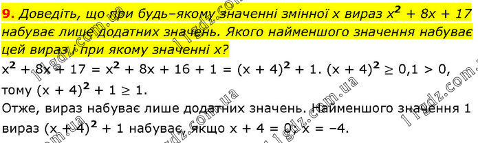 Доведіть, що при будь–якому значенні змінної х вираз x2 + 8х + 17 набуває лише додатних значень. Якого найменшого значення набуває цей вираз і при якому значенні х? x2 + 8x + 17 = x2 + 8х + 16 + 1 = (х + 4)2 + 1. (х + 4)2 ≥ 0,1 > 0, тому (х + 4)2 + 1 ≥ 1. Отже, вираз набуває лише додатних значень. Найменшого значення 1 вираз (х + 4)2 + 1 набуває, якщо х + 4 = 0; х = –4.
