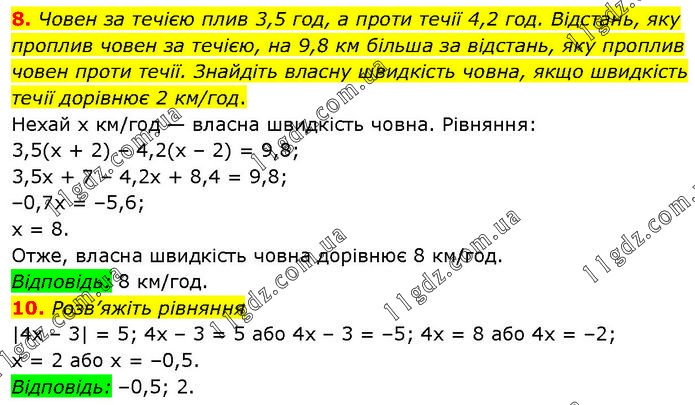 8. Човен за течією плив 3,5 год, а проти течії 4,2 год. Відстань, яку проплив човен за течією, на 9,8 км більша за відстань, яку проплив човен проти течії. Знайдіть власну швидкість човна, якщо швидкість течії дорівнює 2 км/год. Нехай х км/год — власна швидкість човна. Рівняння: 3,5(х + 2) – 4,2(х – 2) = 9,8; 3,5х + 7 – 4,2х + 8,4 = 9,8; –0,7х = –5,6; х = 8. Отже, власна швидкість човна дорівнює 8 км/год. Відповідь: 8 км/год. 10. Розв’яжіть рівняння |4х – 3| = 5; 4х – 3 = 5 або 4х – 3 = –5; 4х = 8 або 4х = –2; х = 2 або х = –0,5. Відповідь: –0,5; 2.
