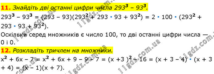 11. Знайдіть дві останні цифри числа 2933 – 933. 2933 – 933 = (293 – 93)(2932 + 293 ∙ 93 + 932) = 2 ∙ 100 ∙ (2932 + 293 ∙ 93 + 932). Оскільки серед множників є число 100, то дві останні цифри числа — 0 і 0. 12. Розкладіть тричлен на множники. х2 + 6х – 7 = х2 + 6х + 9 – 9 – 7 = (х +3 )2 – 16 = (х + 3 – 4) ∙ (х + 3 + 4) = (x – 1)(х + 7).