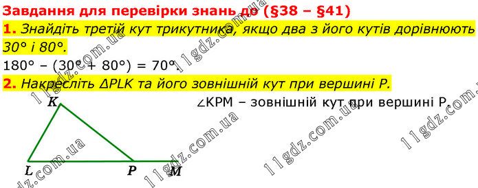 Завдання для перевірки знань до (§38 – §41) 1. Знайдіть третій кут трикутника, якщо два з його кутів дорівнюють 30° і 80°. 180° – (30° + 80°) = 70°. 2. Накресліть ΔPLK та його зовнішній кут при вершині Р. ∠KPM – зовнішній кут при вершині Р.