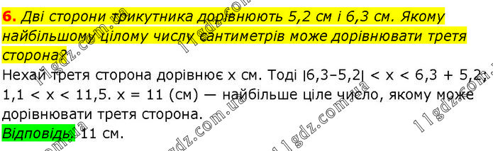 Дві сторони трикутника дорівнюють 5,2 см і 6,3 см. Якому найбільшому цілому числу сантиметрів може дорівнювати третя сторона? Нехай третя сторона дорівнює х см. Тоді ∣6,3–5,2∣ < х < 6,3 + 5,2; 1,1 < х < 11,5. х = 11 (см) — найбільше ціле число, якому може дорівнювати третя сторона. Відповідь. 11 см.