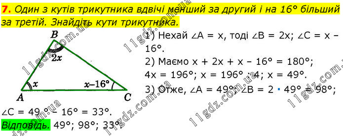 Один з кутів трикутника вдвічі менший за другий і на 16° більший за третій. Знайдіть кути трикутника. 1) Нехай ∠A = x, тоді ∠B = 2х; ∠C = х – 16°. 2) Маємо х + 2х + х – 16° = 180°; 4х = 196°; х = 196° : 4; х = 49°. 3) Отже, ∠A = 49°; ∠B = 2 ∙ 49° = 98°; ∠C = 49 ° – 16° = 33°. Відповідь. 49°; 98°; 33°.