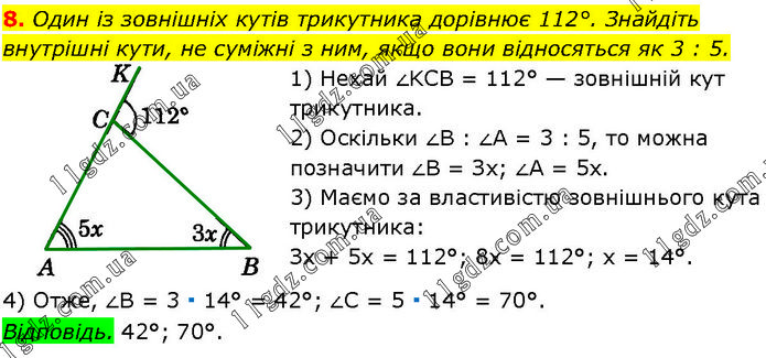 Один із зовнішніх кутів трикутника дорівнює 112°. Знайдіть внутрішні кути, не суміжні з ним, якщо вони відносяться як 3 : 5. 1) Нехай ∠KCB = 112° — зовнішній кут трикутника. 2) Оскільки ∠B : ∠A = 3 : 5, то можна позначити ∠B = Зх; ∠A = 5х. 3) Маємо за властивістю зовнішнього кута трикутника: Зх + 5х = 112°; 8х = 112°; х = 14°. 4) Отже, ∠B = 3 ∙ 14° = 42°; ∠C = 5 ∙ 14° = 70°. Відповідь. 42°; 70°.