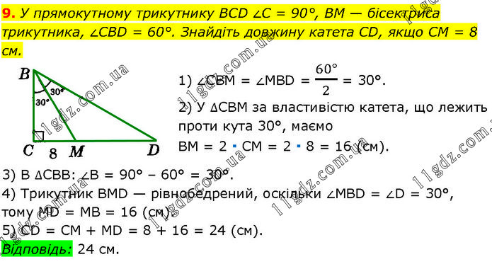 У прямокутному трикутнику BCD ∠C = 90°, BM — бісектриса трикутника, ∠CBD = 60°. Знайдіть довжину катета CD, якщо CM = 8 см. 1) ∠CBM = ∠MBD = (60°)/2 = 30°. 2) У ∆CBM за властивістю катета, що лежить проти кута 30°, маємо BM = 2 ∙ CM = 2 ∙ 8 = 16 (см). 3) В ∆CBB: ∠B = 90° – 60° = 30°. 4) Трикутник BMD — рівнобедрений, оскільки ∠MBD = ∠D = 30°, тому MD = MB = 16 (см). 5) CD = CM + MD = 8 + 16 = 24 (см). Відповідь: 24 см.