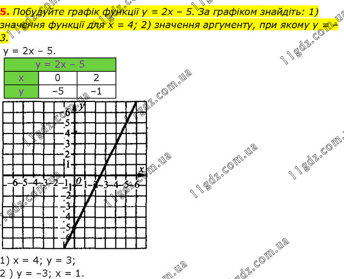 Побудуйте графік функції у = 2х – 5. За графіком знайдіть: 1) значення функції для х = 4; 2) значення аргументу, при якому у = –3. 1) x = 4; y = 3; 2 ) y = –3; x = 1.