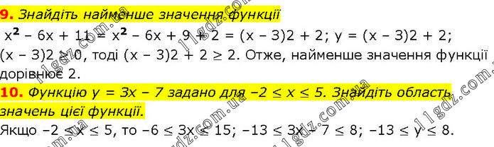 9. Знайдіть найменше значення функції x2 – 6х + 11 = x2 – 6х + 9 + 2 = (х – З)2 + 2; у = (х – З)2 + 2; (х – З)2 ≥ 0, тоді (х – 3)2 + 2 ≥ 2. Отже, найменше значення функції дорівнює 2. 10. Функцію у = Зх – 7 задано для –2 ≤ x ≤ 5. Знайдіть область значень цієї функції. Якщо –2 ≤ х ≤ 5, то –6 ≤ Зх ≤ 15; –13 ≤ Зх – 7 ≤ 8; –13 ≤ у ≤ 8.