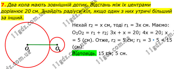 Два кола мають зовнішній дотик. Відстань між їх центрами дорівнює 20 см. Знайдіть радіуси кіл, якщо один з них утричі більший за інший. Нехай r2 = х см, тоді r1 = Зх см. Маємо: O1O2 = r1 + r2; Зх + х = 20; 4х = 20; х = 5 (см). Отже, r2 = 5 см; r1 = 3 ∙ 5 = 15 (см). Відповідь. 15 см; 5 см.