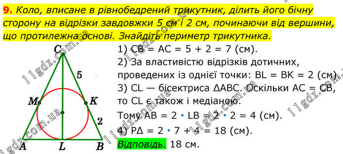Коло, вписане в рівнобедрений трикутник, ділить його бічну сторону на відрізки завдовжки 5 см і 2 см, починаючи від вершини, що протилежна основі. Знайдіть периметр трикутника. 1) CB = AC = 5 + 2 = 7 (см). 2) За властивістю відрізків дотичних, проведених із однієї точки: BL = BK = 2 (см). 3) CL — бісектриса ∆ABC. Оскільки AC = CB, то CL є також і медіаною. Тому AB = 2 ∙ LB = 2 ∙ 2 = 4 (см). 4) P∆ = 2 ∙ 7 + 4 = 18 (см). Відповідь. 18 см.