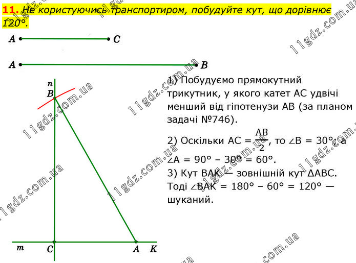 Не користуючись транспортиром, побудуйте кут, що дорівнює 120°. 1) Побудуємо прямокутний трикутник, у якого катет AC удвічі менший від гіпотенузи AB (за планом задачі №5113). 2) Оскільки AC = АВ/2, то ∠B = 30°; a ∠A = 90° – 30° = 60°. 3) Кут BAK — зовнішній кут ∆ABC. Тоді ∠BAK = 180° – 60° = 120° — шуканий.