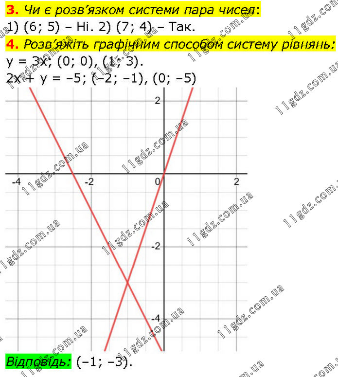 3. Чи є розв’язком системи пара чисел: 1) (6; 5) – Ні. 2) (7; 4) – Так. 4. Розв’яжіть графічним способом систему рівнянь: у = 3х; (0; 0), (1; 3). 2х + у = –5; (–2; –1), (0; –5) Відповідь: (–1; –3).