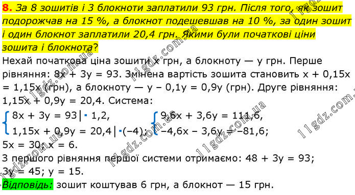 За 8 зошитів і 3 блокноти заплатили 93 грн. Після того, як зошит подорожчав на 15 %, а блокнот подешевшав на 10 %, за один зошит і один блокнот заплатили 20,4 грн. Якими були початкові ціни зошита і блокнота? Нехай початкова ціна зошити х грн, а блокноту — у грн. Перше рівняння: 8х + 3у = 93. Змінена вартість зошита становить х + 0,15х = 1,15х (грн), а блокноту — y – 0,1y = 0,9y (грн). Друге рівняння: 1,15х + 0,9y = 20,4. Система: