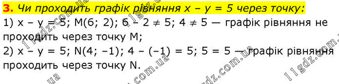 Чи проходить графік рівняння х – у = 5 через точку: 1) х – y = 5; М(6; 2); 6 – 2 ≠ 5; 4 ≠ 5 — графік рівняння не проходить через точку М; 2) х – у = 5; N(4; –1); 4 – (–1) = 5; 5 = 5 — графік рівняння проходить через точку N.