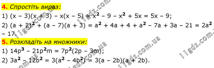 4. Спростіть вираз: 1) (х – 3)(х + 3) – х(х – 5) = х2 – 9 – х2 + 5х = 5х – 9; 2) (а + 2)2 + (а – 7)(а + 3) = a2 + 4а + 4 + а2 – 7а + За – 21 = 2а2 – 17. 5. Розкладіть на множники: 1) 14р3 – 21р2m = 7р2(2р – Зm); 2) 3а2 – 12b2 = 3(а2 – 4b2) = 3(а – 2b)(а + 2b).