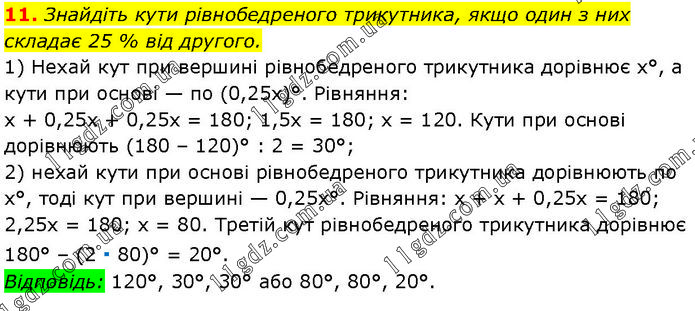 Знайдіть кути рівнобедреного трикутника, якщо один з них складає 25 % від другого. 1) Нехай кут при вершині рівнобедреного трикутника дорівнює х°, а кути при основі — по (0,25х)°. Рівняння: х + 0,25х + 0,25х = 180; 1,5х = 180; х = 120. Кути при основі дорівнюють (180 – 120)° : 2 = 30°; 2) нехай кути при основі рівнобедреного трикутника дорівнюють по х°, тоді кут при вершині — 0,25х°. Рівняння: х + х + 0,25х = 180; 2,25х = 180; х = 80. Третій кут рівнобедреного трикутника дорівнює 180° – (2 ∙ 80)° = 20°. Відповідь: 120°, 30°, 30° або 80°, 80°, 20°.