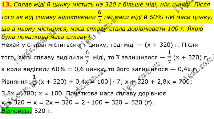 Сплав міді й цинку містить на 320 г більше міді, ніж цинку. Після того як від сплаву відокремили 6/7 тієї маси міді й 60% тієї маси цинку, що в ньому містилися, маса сплаву стала дорівнювати 100 г. Якою була початкова маса сплаву? Нехай у сплаві міститься х г цинку, тоді міді — (х + 320) г. Після того, як зі сплаву виділили 6/7 міді, то її залишилося — 1/7 (х + 320) г, а коли виділили 60% = 0,6 цинку, то його залишилося — 0,4х г. Рівняння: 1/7 (х + 320) + 0,4х = 100│∙ 7; х + 320 + 2,8х = 700; 3,8х = 380; х = 100. Початкова маса сплаву дорівнює х + 320 + х = 2х + 320 = 2 ∙ 100 + 320 = 520 (г). Відповідь: 520 г.