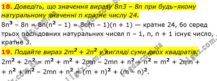 18. Доведіть, що значення виразу 8n3 – 8n при будь–якому натуральному значенні n кратне числу 24. 8n3 – 8n = 8n(n2 – 1) = 8n(n – 1)(n + 1) — кратне 24, бо серед трьох послідовних натуральних чисел n – 1, n, n + 1 існує число, кратне 3. 19. Подайте вираз 2m2 + 2n2 у вигляді суми двох квадратів. 2m2 + 2n2 = m2 + m2 + 2mn – 2mn + n2 + n2 = m2 + 2mn + n2 + m2 – 2mn + n2 = (m + n)2 + (m – n)2.