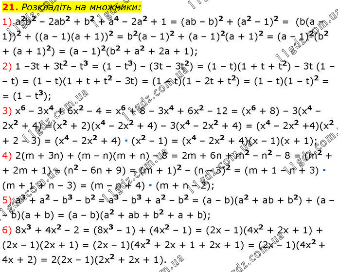 Розкладіть на множники: 1) а2b2 – 2аb2 + b2 + а4 – 2a2 + 1 = (ab – b)2 + (а2 – 1)2 = (b(а – 1))2 + ((а – 1)(a + 1))2 = b2(а – 1)2 + (а – 1)2(а + 1)2 = (а – 1)2(b2 + (а + 1)2) = (a – 1)2(b2 + a2 + 2a + 1); 2) 1 –3t + 3t2 – t3 = (1 – t3) – (3t – 3t2) = (1 – t)(1 + t + t2) – 3t (1 – t) = (1 – t)(1 + t + t2 – 3t) = (1 – t)(1 – 2t + t2) = (1 – t)(1 – t)2 = (1 – t3); 3) x6 – Зх4 + 6х2 – 4 = x6 + 8 – 3х4 + 6х2 – 12 = (х6 + 8) – 3(х4 –2x2 + 4) =(х2 + 2)(х4 – 2х2 + 4) – 3(х4 – 2х2 + 4) = (х4 – 2х2 +4)(х2 + 2 – 3) = (х4 – 2х2 + 4) ∙ (х2 – 1) = (х4 – 2х2 + 4)(х – 1)(х + 1); 4) 2(m + 3n) + (m – n)(m + n) – 8 = 2m + 6n + m2 – n2 – 8 = (m2 + 2m + 1) – (n2 – 6n + 9) = (m + 1)2 – (n – З)2 = (m + 1 – n + 3) ∙ (m + 1 + n – 3) = (m – n + 4) ∙ (m + n – 2); 5) a3 + a2 – b3 – b2 = a3 – b3 + a2 – b2 = (a – b)(a2 + ab + b2) + (a – b)(a + b) = (a – b)(a2 + ab + b2 + a + b); 6) 8x3 + 4x2 – 2 = (8x3 – 1) + (4x2 – 1) = (2x – 1)(4x2 + 2x + 1) + (2x – 1)(2x + 1) = (2x – 1)(4x2 + 2x + 1 + 2x + 1) = (2x – 1)(4x2 + 4x + 2) = 2(2x – 1)(2x2 + 2x + 1).