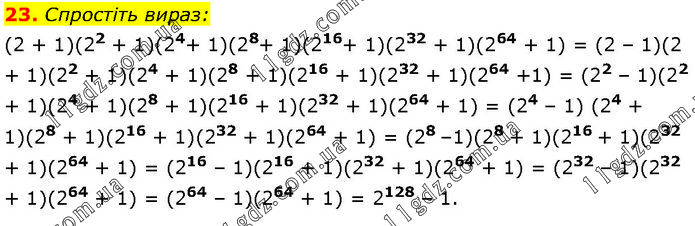 Спростіть вираз: (2 + 1)(22 + 1)(24+ 1)(28+ 1)(216+ 1)(232 + 1)(264 + 1) = (2 – 1)(2 + 1)(22 + 1)(24 + 1)(28 + 1)(216 + 1)(232 + 1)(264 +1) = (22 – 1)(22 + 1)(24 + 1)(28 + 1)(216 + 1)(232 + 1)(264 + 1) = (24 – 1) (24 + 1)(28 + 1)(216 + 1)(232 + 1)(264 + 1) = (28 –1)(28 + 1)(216 + 1)(232 + 1)(264 + 1) = (216 – 1)(216 + 1)(232 + 1)(264 + 1) = (232 – 1)(232 + 1)(264 + 1) = (264 – 1)(264 + 1) = 2128 – 1.