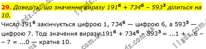 Доведіть, що значення виразу 1916 + 7346 – 5933 ділиться на 10. Число 1916 закінчується цифрою 1, 7346 — цифрою 6, а 5933 — цифрою 7. Тоді значення виразу 1916 + 7346 – 5933 = ...1 + ...6 – 7 = ...0 — кратне 10.