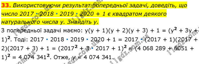 Використовуючи результат попередньої задачі, доведіть, що число 2017 ∙ 2018 ∙ 2019 ∙ 2020 + 1 є квадратом деякого натурального числа у. Знайдіть у. З попередньої задачі маємо: у(у + 1)(у + 2)(у + 3) + 1 = (у2 + Зу + 1)2. Тоді: 2017 ∙ 2018 ∙ 2019 ∙ 2020 + 1 = 2017 ∙ (2017 + 1)(2017 + 2)(2017 + 3) + 1 = (20172 + 3 ∙ 2017 + 1)2 = (4 068 289 + 6051 + 1)2 = 4 074 3412. Отже, у = 4 074 341.
