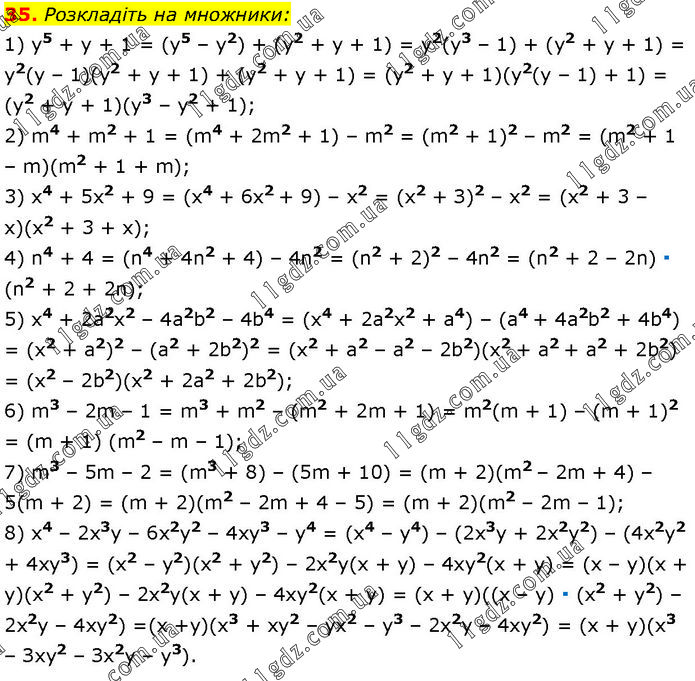 Розкладіть на множники: 1) у5 + у + 1 = (у5 – у2) + (у2 + у + 1) = y2(y3 – 1) + (y2 + у + 1) = y2(y – 1)(y2 + y + 1) + (y2 + y + 1) = (y2 + y + 1)(y2(y – 1) + 1) = (y2 + у + 1)(y3 – y2 + 1); 2) m4 + m2 + 1 = (m4 + 2m2 + 1) – m2 = (m2 + 1)2 – m2 = (m2 + 1 – m)(m2 + 1 + m); 3) x4 + 5x2 + 9 = (х4 + 6х2 + 9) – x2 = (х2 + З)2 – x2 = (х2 + 3 – х)(х2 + 3 + х); 4) n4 + 4 = (n4 + 4n2 + 4) – 4n2 = (n2 + 2)2 – 4n2 = (n2 + 2 – 2n) ∙ (n2 + 2 + 2n); 5) x4 + 2a2x2 – 4a2b2 – 4b4 = (х4 + 2а2x2 + а4) – (а4 + 4а2b2 + 4b4) = (х2 + а2)2 – (а2 + 2b2)2 = (х2 + а2 – а2 – 2b2)(х2 + а2 + а2 + 2b2) = (х2 – 2b2)(х2 + 2а2 + 2b2); 6) m3 – 2m – 1 = m3 + m2 – (m2 + 2m + 1) = m2(m + 1) – (m + 1)2 = (m + 1) (m2 – m – 1); 7) m3 – 5m – 2 = (m3 + 8) – (5m + 10) = (m + 2)(m2 – 2m + 4) – 5(m + 2) = (m + 2)(m2 – 2m + 4 – 5) = (m + 2)(m2 – 2m – 1); 8) x4 – 2х3у – 6х2у2 – 4ху3 – у4 = (х4 – у4) – (2х3у + 2x2y2) – (4x2y2 + 4ху3) = (х2 – у2)(х2 + у2) – 2х2у(х + у) – 4xy2(х + у) = (х – у)(х + у)(х2 + у2) – 2х2у(х + у) – 4хy2(х + у) = (х + у)((х – у) ∙ (x2 + y2) – 2x2y – 4xy2) =(x +y)(x3 + xy2 – ух2 – y3 – 2х2у – 4xy2) = (х + у)(х3 – Зху2 – Зх2у – у3).